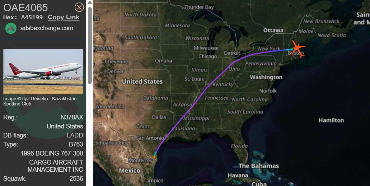 The Boeing 767 operated by Omni Air International left Harlingen, Tx., at 9:13 p.m. ET on Sunday night and landed just after 1 a.m. Monday, flight data shows. It was scheduled to stop in Portsmouth before flying to Sofia, Bulgaria, but the airport was closed due to the blizzard hitting the northeast. Both cities are regular refueling stops for Omni's deportation routes to Asia.
