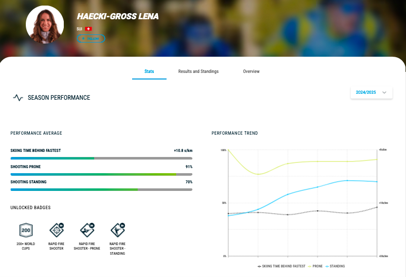 For each race, the top 40 athletes are awarded points, which determines their overall standings in the World Cup season. First place gets 90 points, 40th gets one. The IBU (the FIFA of biathlon but slightly less corrupt) has a really good app, where you can follow your favorite athletes, keep track of World Cup scoring and drill down on stats to your hyperfocus heart’s content.